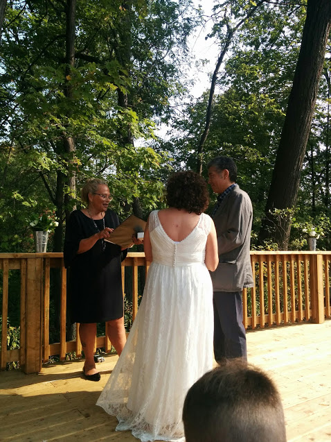 Sandra Ruch was awesome. She started off by sending us a bunch of possibilities for the ceremony, and we chose what to include and what not to include. It was really well-suited to us. She was also very warm and lovely. Everybody was very impressed With the ceremony. The groom is Deaf and very shy. She did a wonderful job of making him feel comfortable. There are so many people registered on the Internet, it was a bit overwhelming until we found you. Your list of officiants that gave a little information on them all was very very helpful. And interviewing two also worked well for us. They both seemed amazing. But we picked the one whose lips Dale could read best.