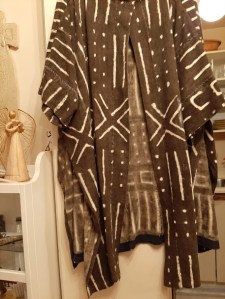 I met Caroline in the early 90’s. I had just started selling African clothing and crafts with my Sudanese husband, Hassan. I was selling in outdoor markets and from my home. Caroline called me one day and she wanted to see what I had. She was opening a consignment store for plus size women and wanted some pieces to accent the store. She bought a piece of mudcloth from me and had it made into this beautiful piece.