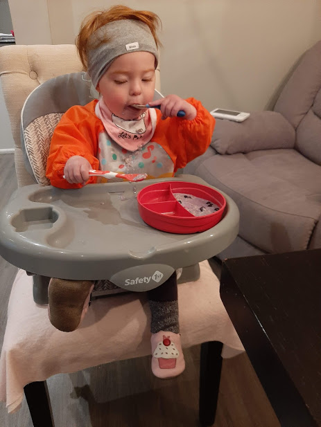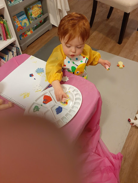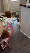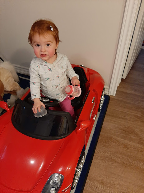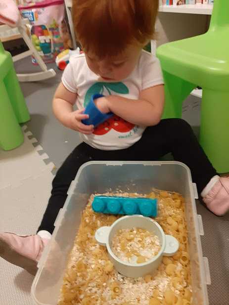 A typical playtime in your play room starts with you playing in your oatmeal/pasta mixture, then your wee refrigerator with the plastic groceries. You pretend to eat and it makes us both laugh when we both have our pretend ice cream cones. You like to colour or paint, build with your blocks, play a little hockey, get in and out of your little red car and when you are done you start up the stairs signaling me that we are done.