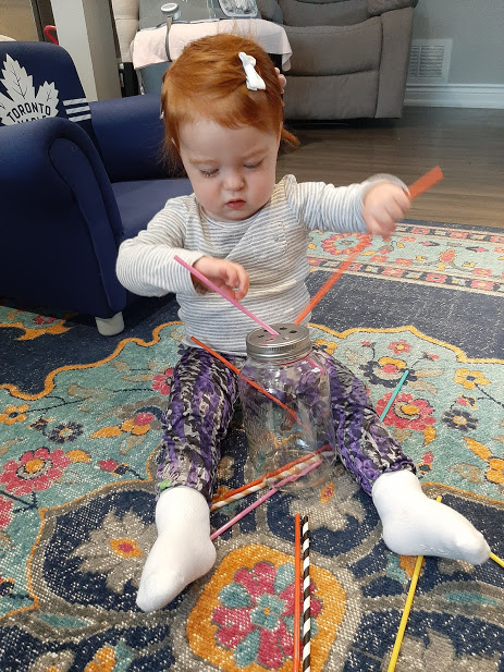 Harper, you love books a lot. Lately you can sit on my knee and listen to me read 4 in row. You had me read Alice in Wonderland from beginning to end. You sit right down to read any new book that comes into the house. You play with a mason jar that was your Mommy’s. You can sit quietly putting straws in the little wholes in the lid for a long time every morning. Mommy used the jar for her homemade scrubbing powder. After breakfast every morning you sit in your armchair and watch Peppa Pig while Bubby finishes her coffee. We get a big kick about touching my mug and saying Hot! Owww!