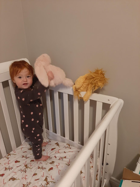 You are a great sleeper – 12 hours every night and a 3 hour nap every afternoon. I ask are you ready for a nap and you head to your bowl of clean soothers, take one and head right to your bed. You rub your hair, look up at me and wait patiently while I turn on your sound machine and shut your curtains. One week every time I came in your room to get you up, I found your stuffies lined up. One morning I caught you in action.