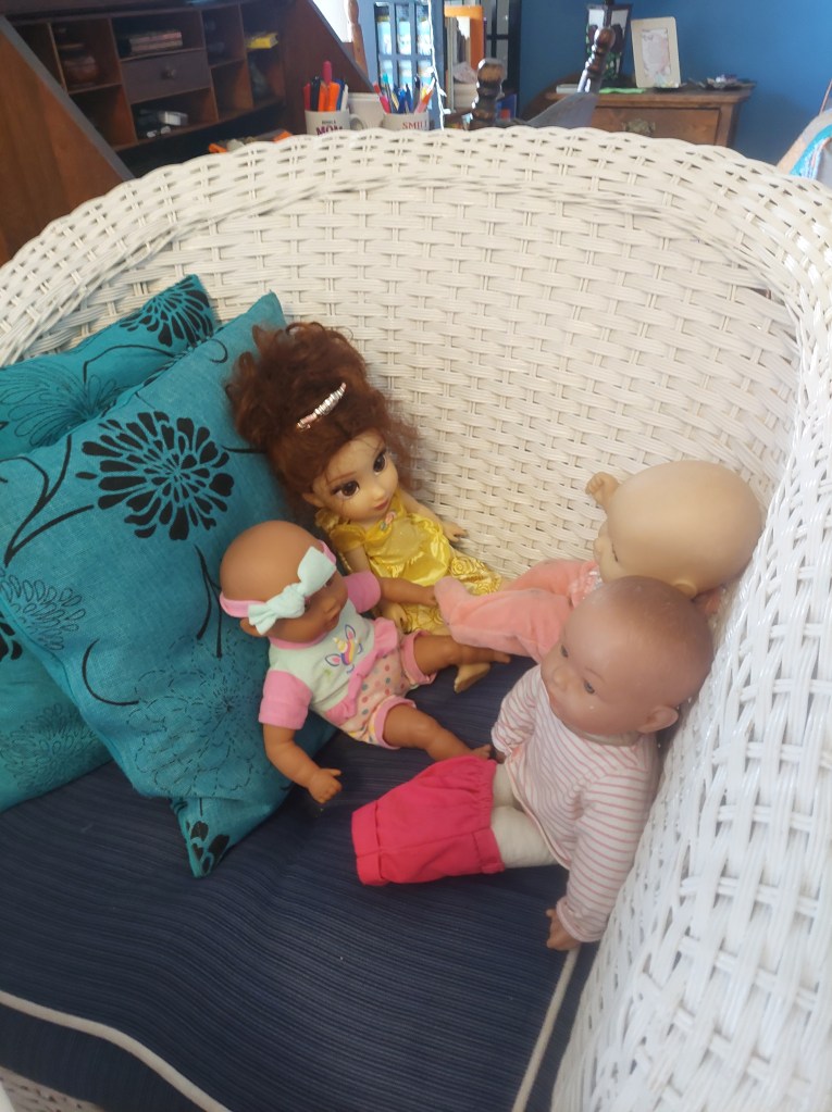 When you visit with me, we spend a lot of time doing crafts and playing with your babies. Every moment is precious to me.  I’m still the voice of the babies and you always impress me with your parenting skills.  Lately, one of them has a birthday and we have a little drama to resolve.  I’m the voice so I like to pose a problem – “Emma pinched me”, or “Belle was too bossy”.