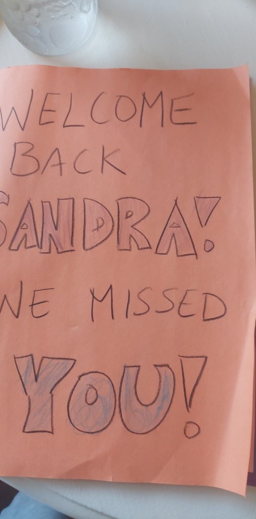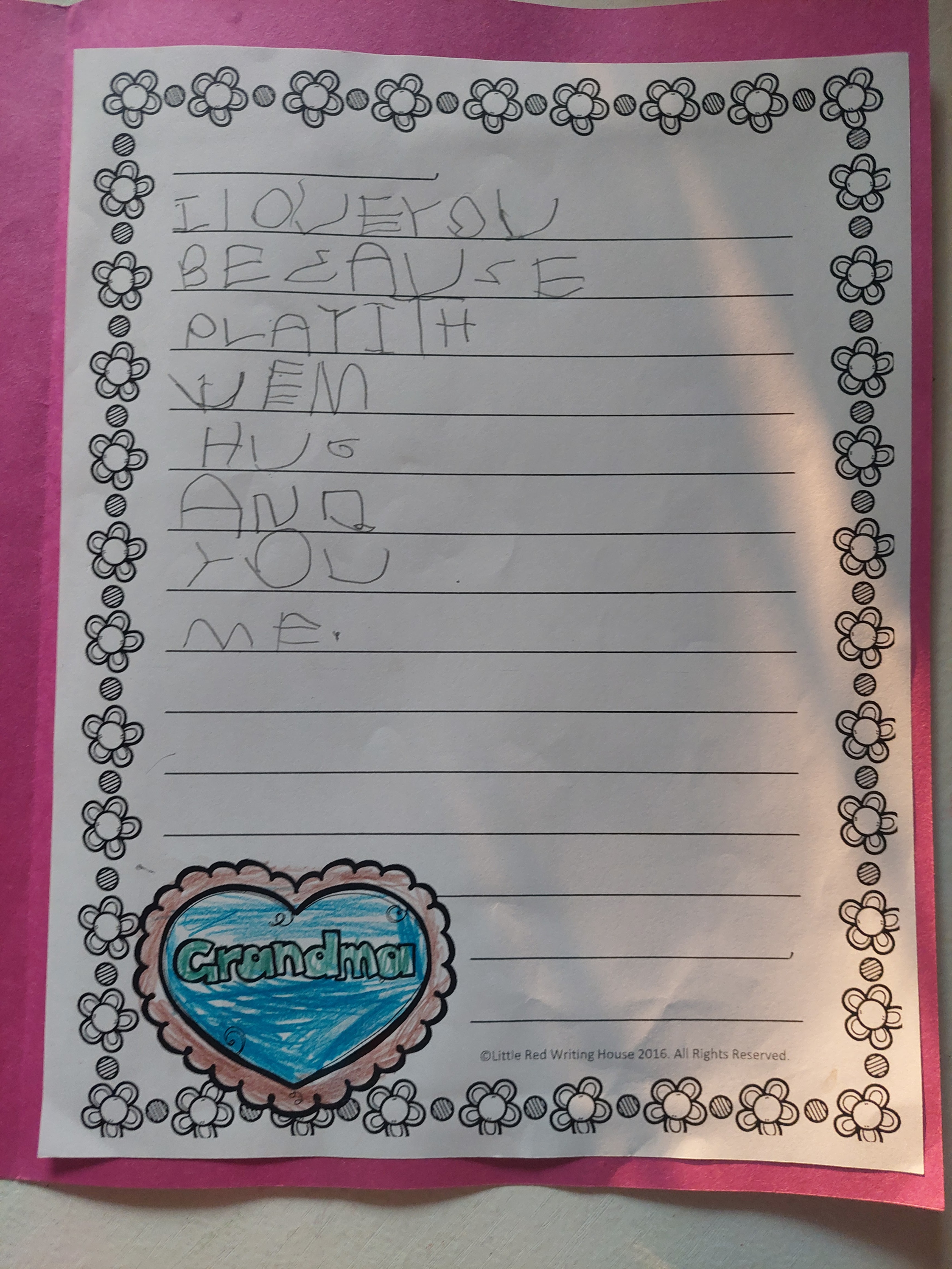 In May, we celebrated Great Bubby’s 103rd birthday. We went to the Cheesecake Factory with Auntie Raya and Oscar, Aunt Paula and Uncle Peter, Cousin Hartley and Lisa. You drove there and back with Hartley and Lisa. It’s good that they live near you. You hadn’t seen them in quite a while but made no fuss getting into the car and driving with them. You know you are loved by so many. We hadn’t seen each other in a month and it was pretty special for us both. Auntie Raya captured a moment of us just staring into each other’s eyes. You cuddled on my lap and it was so good to be with you. For Mother’s Day, your teacher contacted your Daddy to ask who were the important women in your life. You made me and Grandma cards.